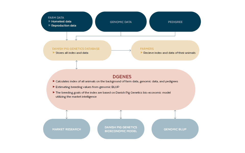 The Danish Genetics Evaluation System (DGENES) combines millions of datapoints from farm recording with genomic data in a genomic BLUP, to produce the Danish Genetics breeding Index (DGI).