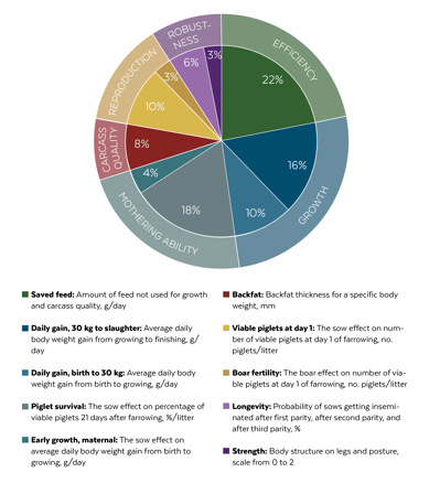 For the maternal line, Danish Yorkshire and Danish Landrace, the new breeding goals Piglet survival, Viable piglets at day 1 and Boar fertility are added. By direct selection for piglet survival, as the percentage of viable piglets on day 21 after farrowing, it is expected to further improve the genetic progress on number of viable and robust piglets at weaning. For Danish Duroc, the breeding goal of Survivability is included as the percentage of viable piglets on day 21 after farrowing in addition to the breeding goal Boar fertility for the number of viable piglets one day after farrowing.