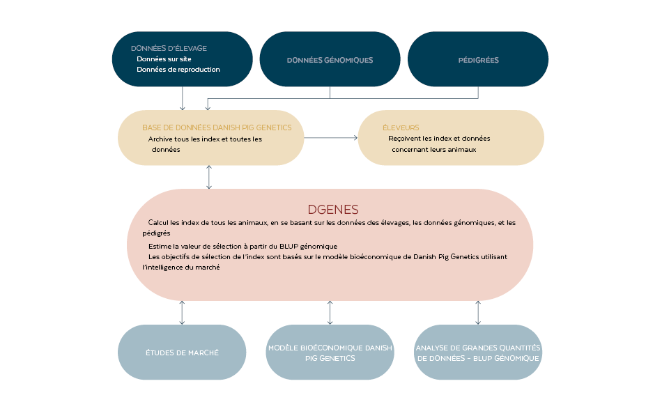 Le Danish Genetics Evaluation System (DGENES) combine des millions de points de données provenant de l'enregistrement des exploitations avec des données génomiques dans un BLUP génomique, permettant de mettre en place le Danish Genetics breeding index (DGI).