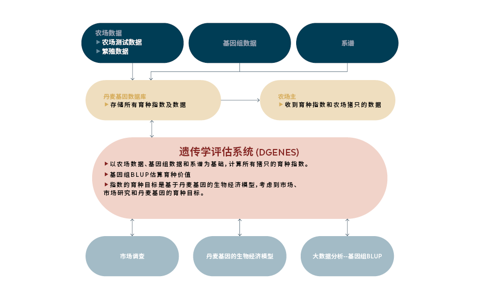 DGENES是一个配备了最先进的遗传学技术的动态系统,可以通过遗传学方法分析数据,提供准确的育种价值。因此,配备了DGENES的丹麦基因公司更适合向全球客户提供遗传服务和产品。育种目标由丹麦基因公司独特的生物经济模型来实现,该模型通过每个性状的经济价值来衡量所选择的性状,以确保价值链上的猪肉生产商获得最高的生产利润。